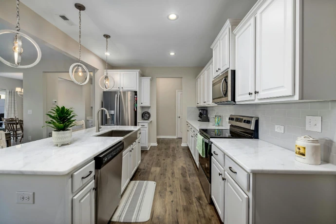A fresh, functional kitchen featuring soft-white quartz countertops with subtle movement, paired with shaker cabinetry.