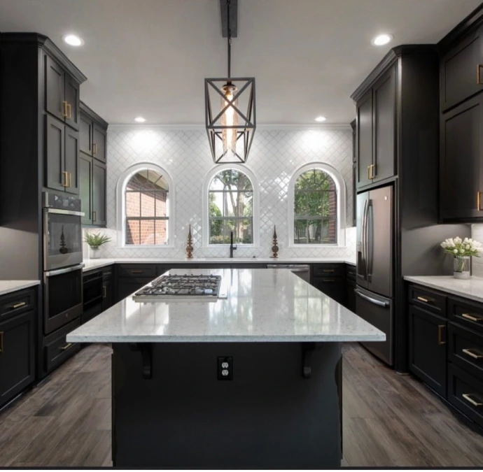 A striking modern kitchen featuring a bright white quartz island and perimeter tops, paired with bold black cabinetry