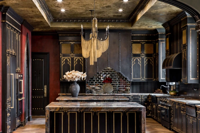 A bold, high-drama kitchen featuring a richly patterned quartzite island and coordinating perimeter tops, bringing natural movement, depth, and contrast to custom dark cabinetry.